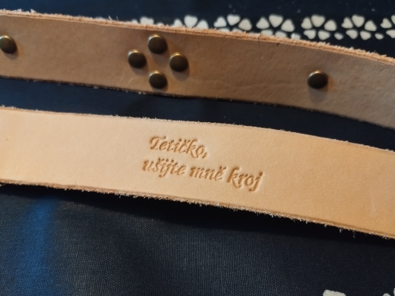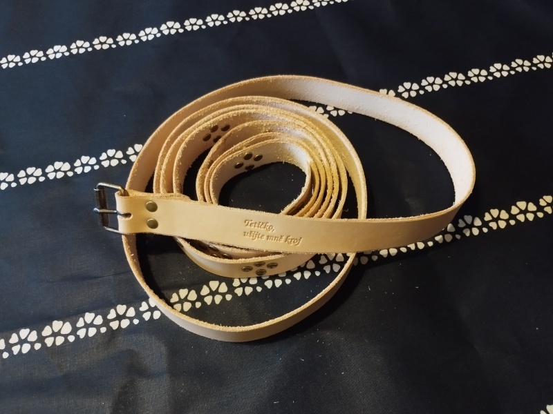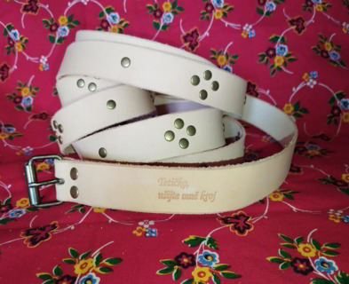 Řemen je vyroben ručně z kvalitní hovězí kůže, lícová strana je hladká, rubová hrubá. Aby jeho délka mohla být podle tradice cca 300 cm, bylo nutné ho slepit ze dvou dílů, protože tak velká kravička se ještě nenarodila. Okraje řemene jsou ručně seříznuté jak z rubu, tak z líce, aby kůže nebyla na hranách ostrá, nevznikaly otřepy a nepoškozovaly krojový oděv. Vybíjené jsou plochými kovovými cvoky podle vzoru, který je tradiční pro naši oblast. Každý z 80-ti cvoků byl vbit opět ručně do řemene s láskou a umem odborníka. Každý řemen nakonec prošel třikrát včelí voskovou lázní ke stabilizaci kůže.